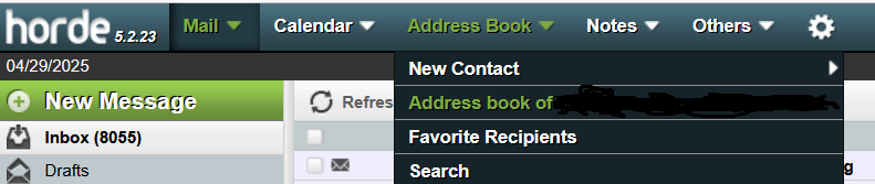 First, login to your Horde Webmail account as you normally would and on the top menu, mouse over ‘Address Book‘ and select ‘Address book of (your email address)‘ as shown below:
