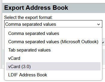 On the next page, look at the bottom section called ‘Export Address Book‘. In the drop-down called ‘Select the export format:‘, choose ‘vCard (3.0)‘ as shown below and then click ‘Export‘